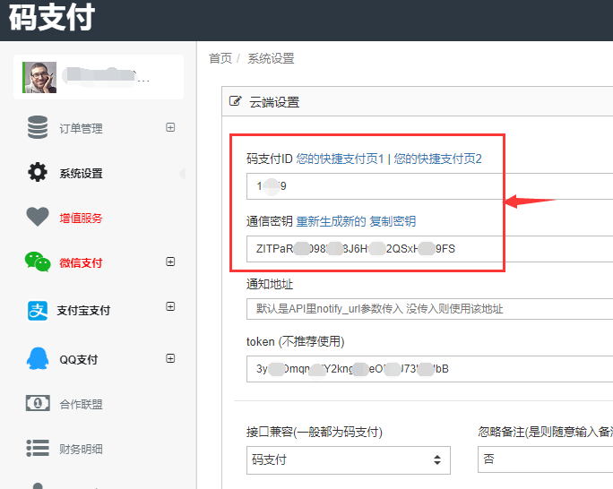 2.进入会员中心-系统设置,获取到码支付ID和通信密钥