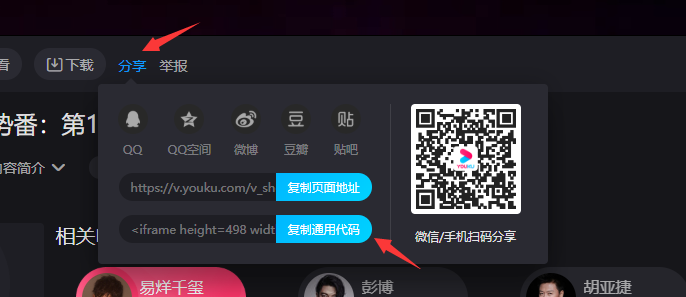 举例:访问优酷,找到视频播放页面,点击分享-复制通用代码,然后粘贴代码即可