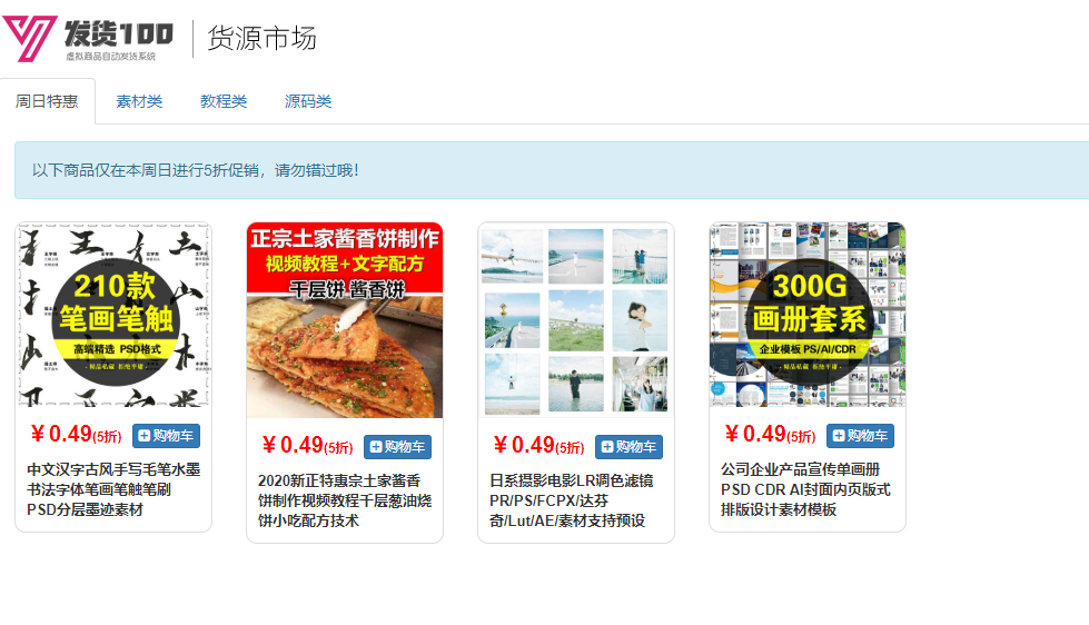 2020-05-17新网站往往缺少素材,货源市场提供海量的商品,可供导入到您自己的网站;全部为真实的商品,可以自己定价及出售给用户。