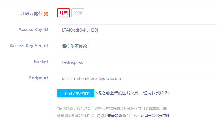 说明:首次开启OSS功能时,请点击一键同步本地文件按钮,这样可以把之前的本地文件上传至OSS