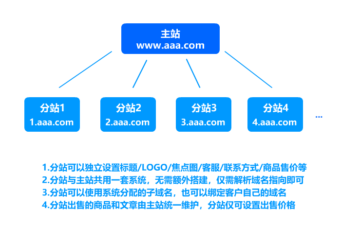 分站出售主站商品:主站统一设置商品/文章的成本价,分站可以单独设置出售价(价格可以略高或略低于主站),当产品售出时,分站可以获的(售价-成本价)的利润