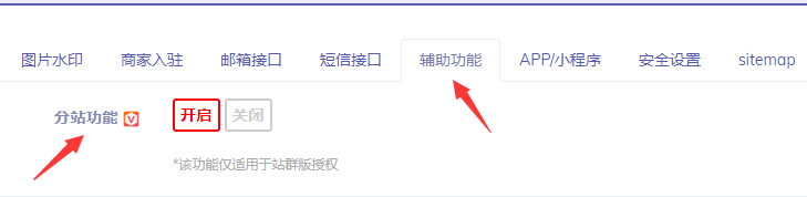如果需要分站功能,需要先开通站群版授权,系统版本需支持v1.1_build20200608以上,模板需更新到最新版
