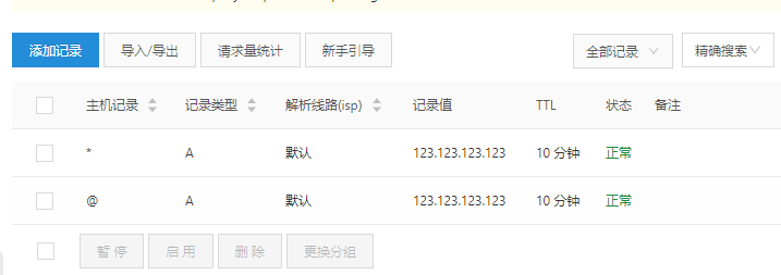 3.设置泛解析:假设您的域名为aaa.com,则解析*.aaa.com和aaa.com指向您的网站IP,此操作是为了给客户分配子域名