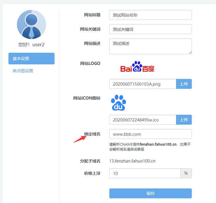 5.客户绑定独立域名:进入会员中心-分站设置-基本设置-绑定域名,输入自己的域名,同时按操作完成解析