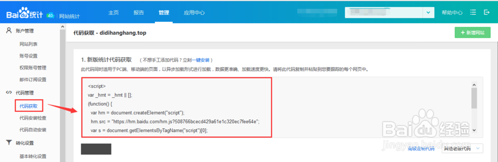 3.完成注册后,就会跳转到网站的统计代码处,如下图,然后复制代码。或者你可以根据百度文档【如何获取百度统计代码】一文来获取这个统计代码。