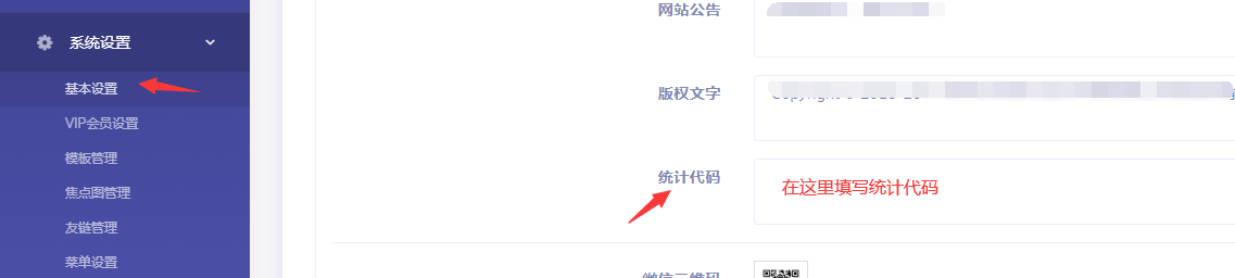 4.制代码后,来到网站后台,点击基本设置,粘贴统计代码