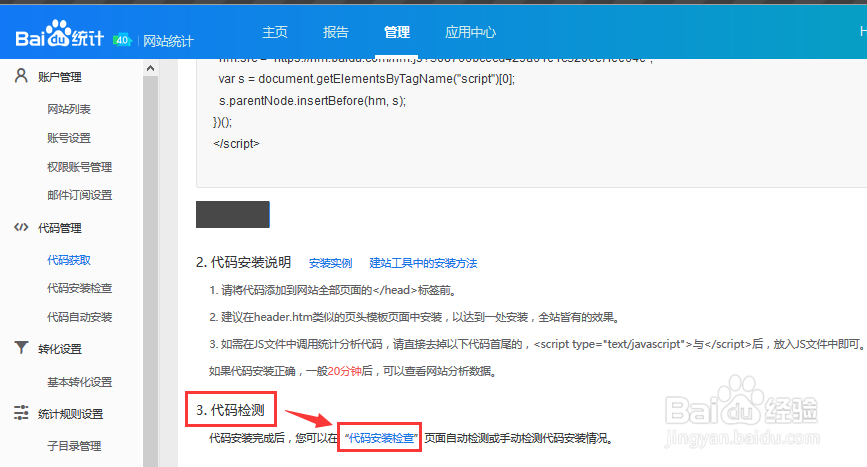 5.检测代码是否安装正确。如果要检测代码是否安装正确,请在网站编辑器里先点击【上线】,这样百度统计才能检测到这段代码。然后来到百度统计的页面,点击【管理】→【代码管理】→【代码安装检查】,点击【代码安装检查】。