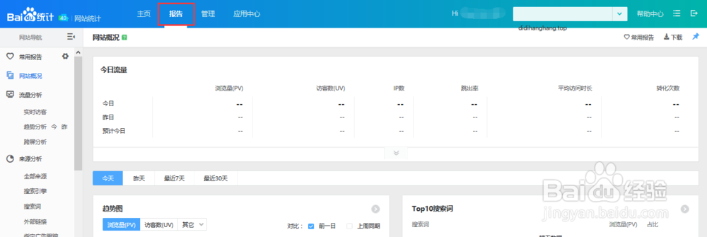 7.根据百度的安装说明,代码安装后20分钟才能查看到网站数据。请耐心等候一段时间,然后再点击【报告】查看网站的数据分析。