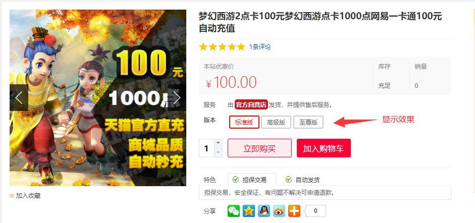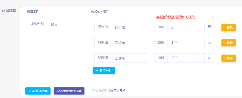 则可以设置商品的基础价格为100元,标准版加价0元,高级版加价100元,至尊版加价200元