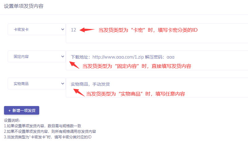 (1)当发货类型为卡密时,发货内容填写卡密分类的ID
