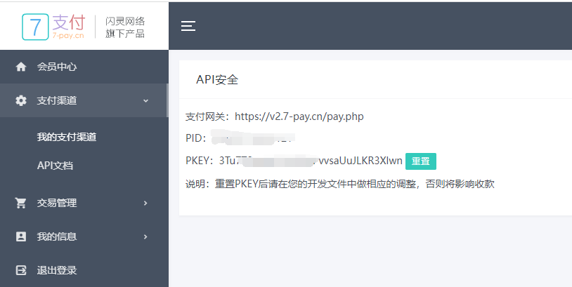 5.在您的网站后台填写7支付PID和PKEY,即可进行收款