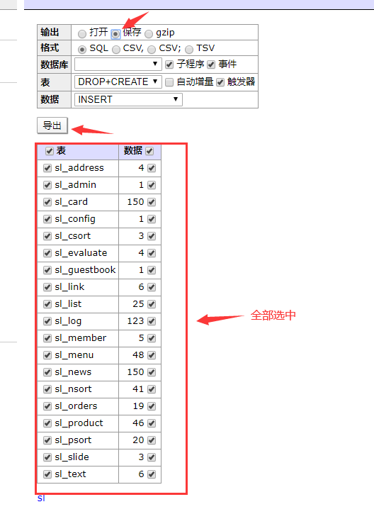 2.进入旧网站数据库管理界面(http://你的旧域名/admin/dbm.php),点击导出SQL