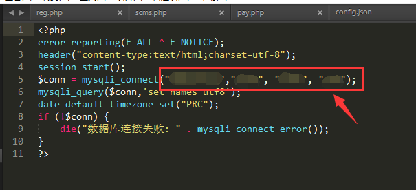 4.打开connconn.php,修改图中所示部分,改为新的数据库连接地址,四项依次为数据库地址,数据库用户名,数据库密码,数据库名称;根据空间商提供的数据库信息进行修改