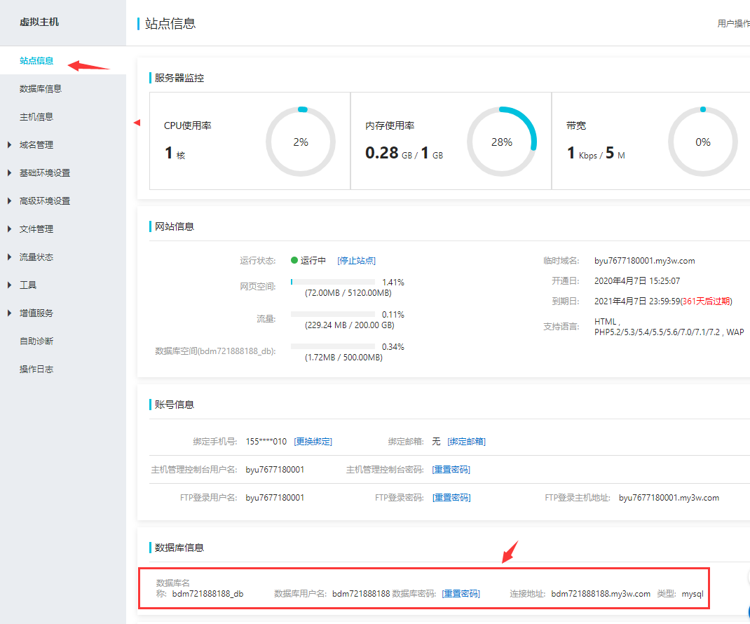 这三项可以在虚拟主机的面板获取到