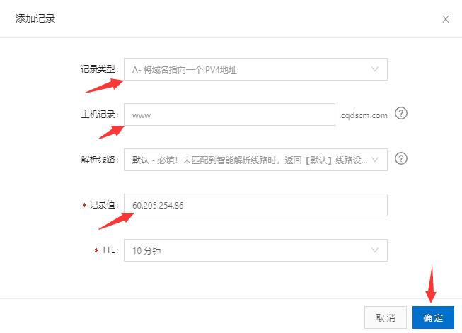 记录类型:A记录 主机记录:www 记录值:填主机的IP地址