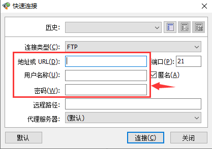 安装FlashFXP后,点击“快速连接”,输入IP地址、用户名、密码三项即可